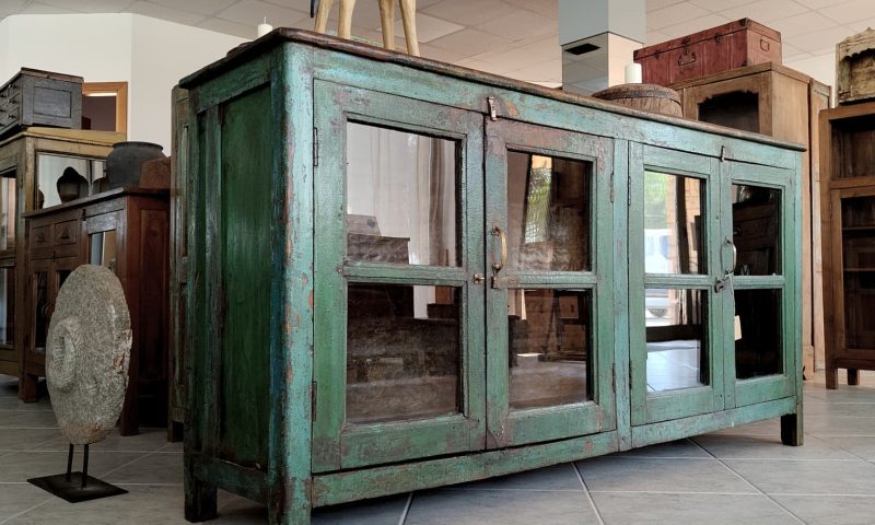 Credenza coloniale verde con 4 ante e schienale in metallo...