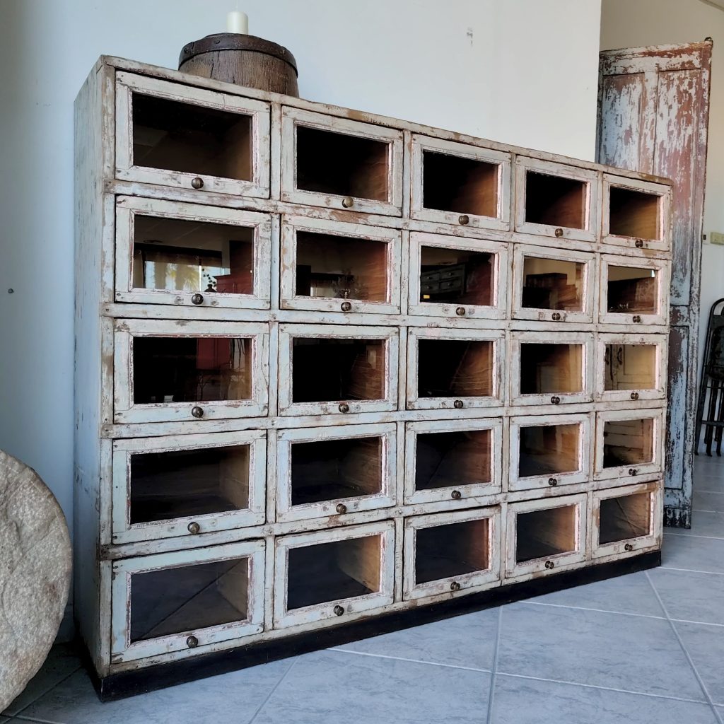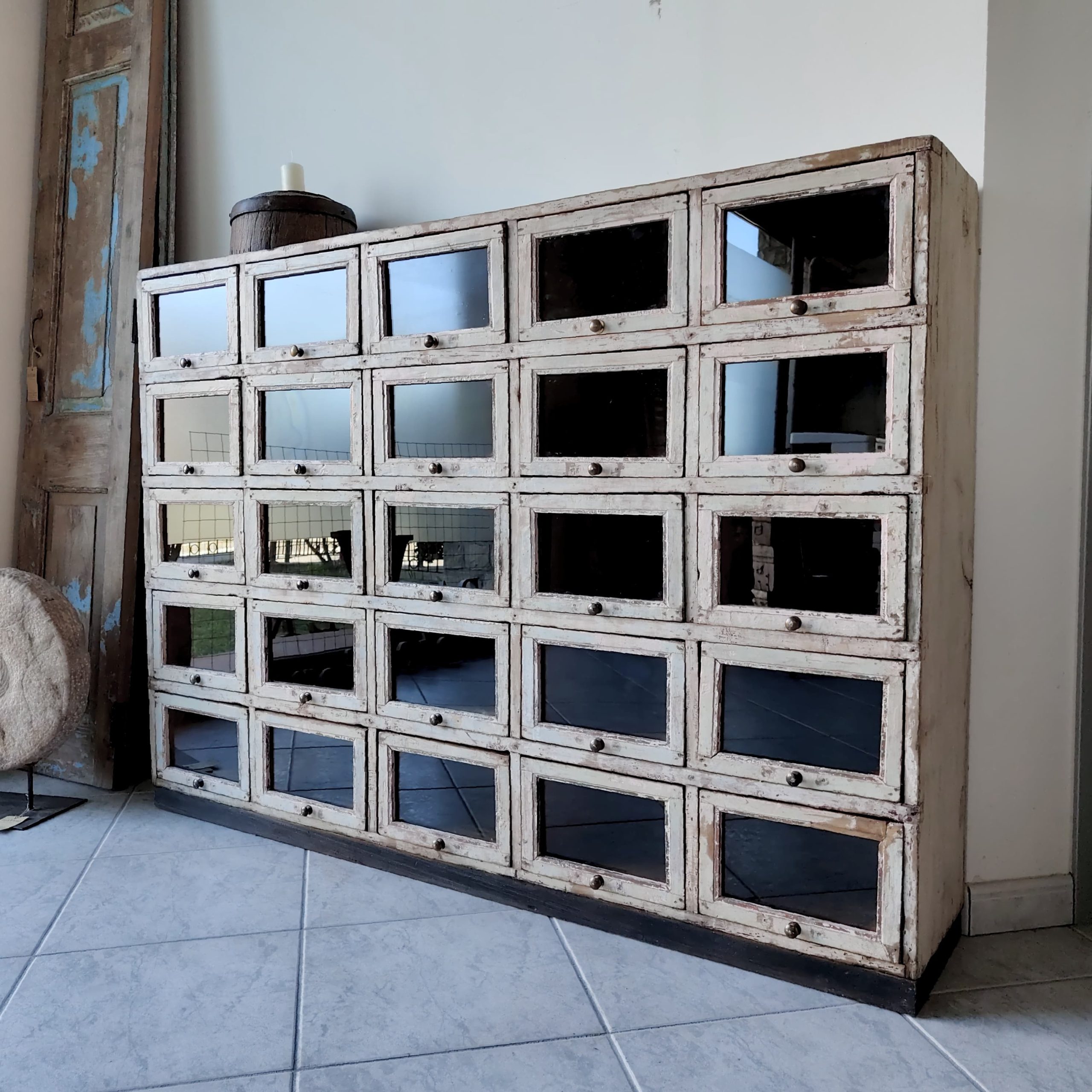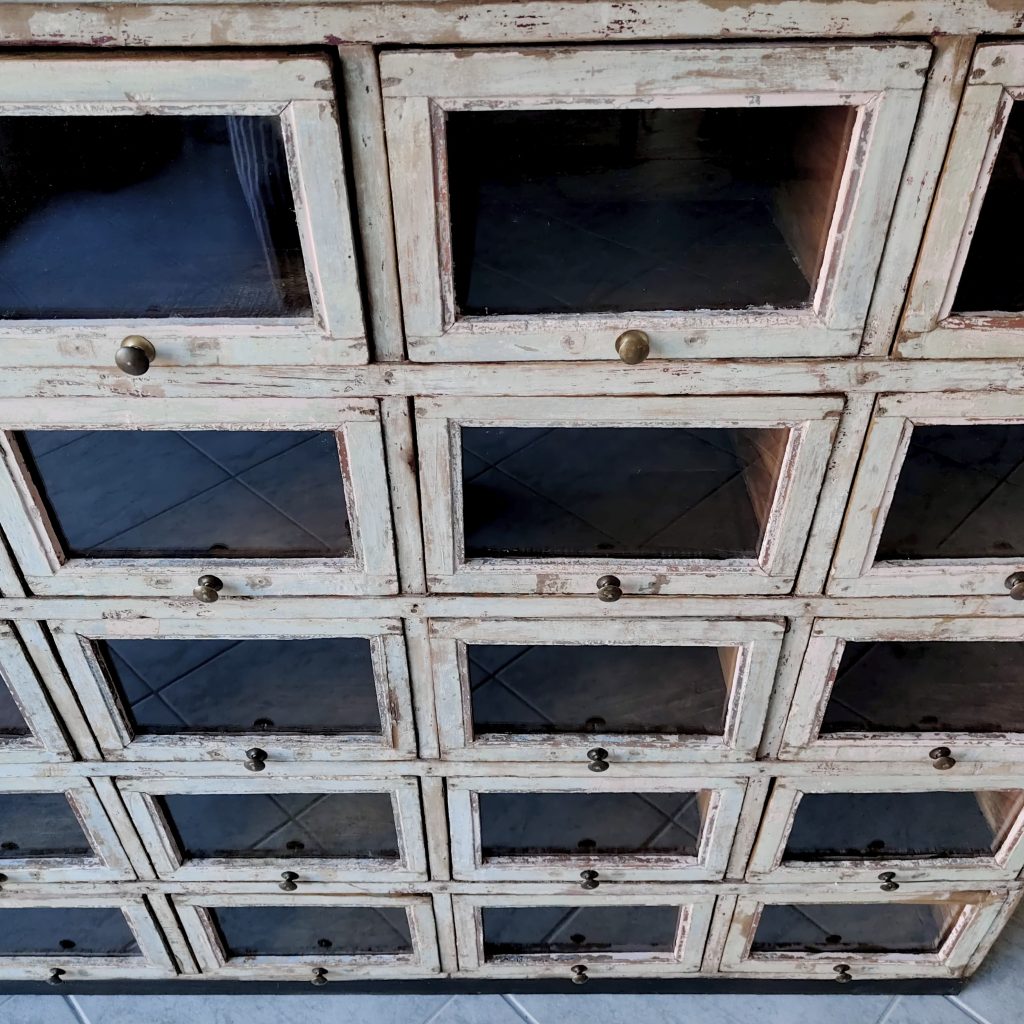 Splendida, imponente cassettiera con cassetti dotati di vetro nella parte frontale.