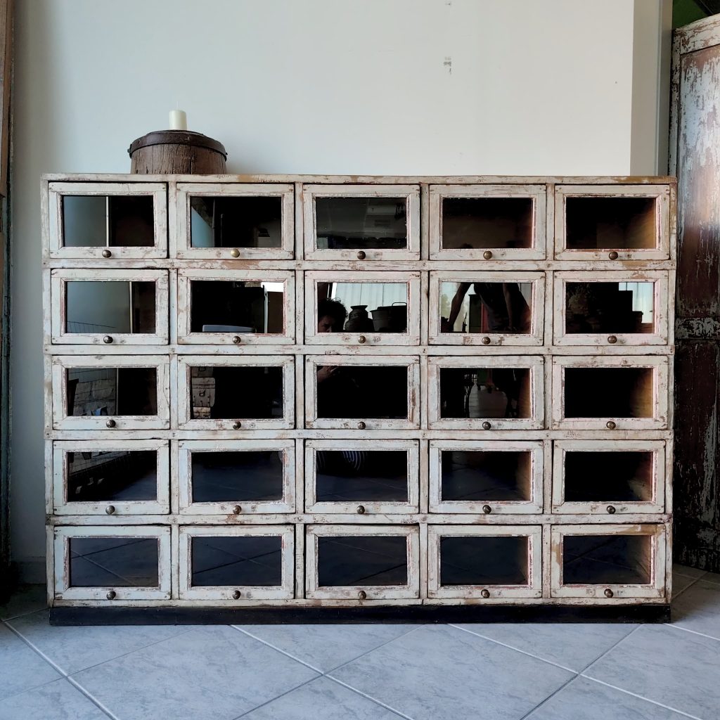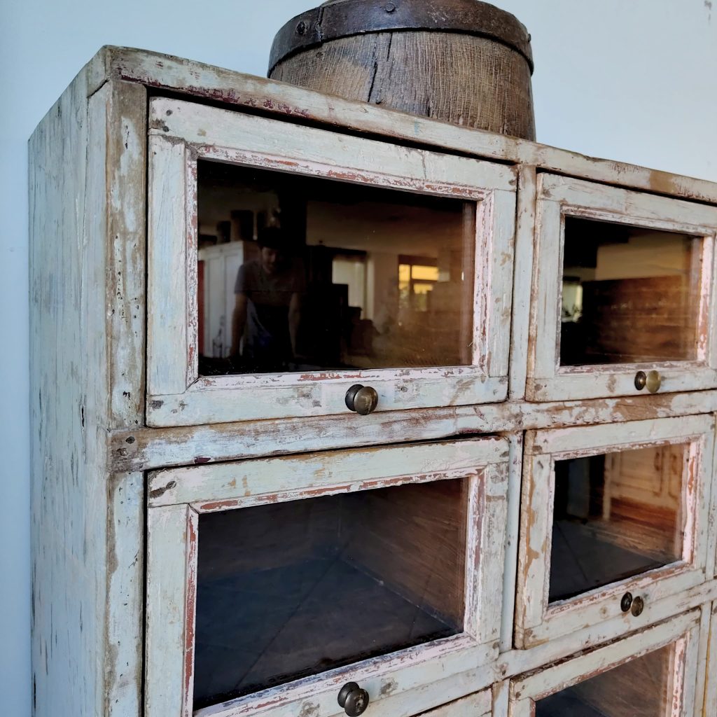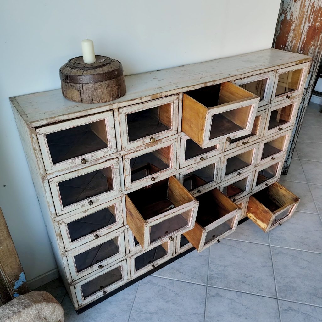 Splendida, imponente cassettiera con cassetti dotati di vetro nella parte frontale.