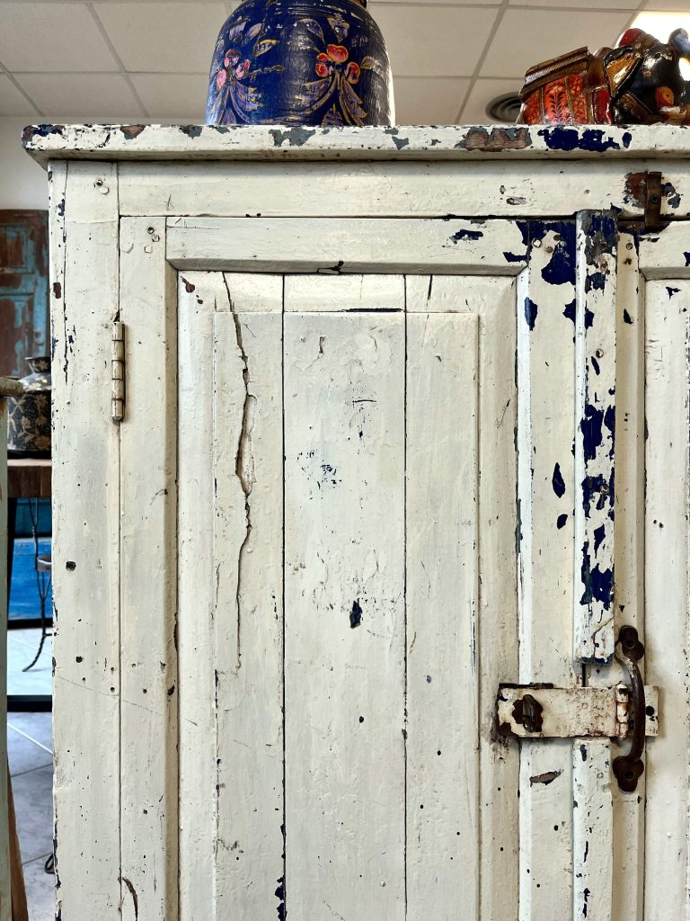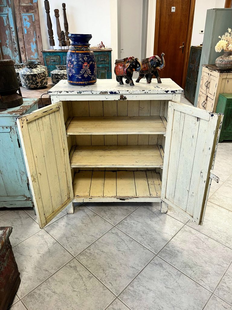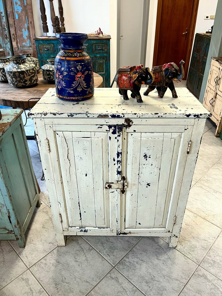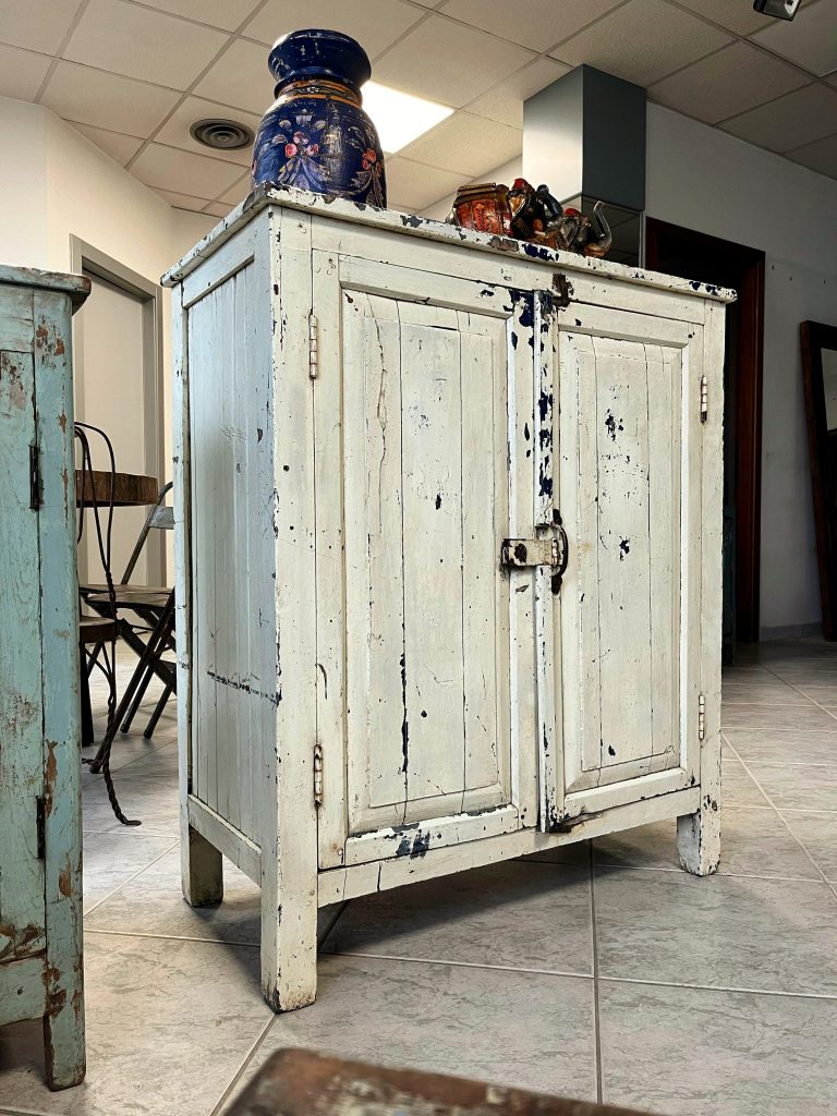 Bellissimo mobiletto bianco con tracce di colore blu oltremare che affiorano in superficie.