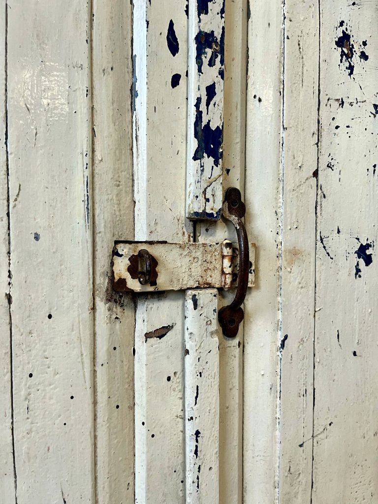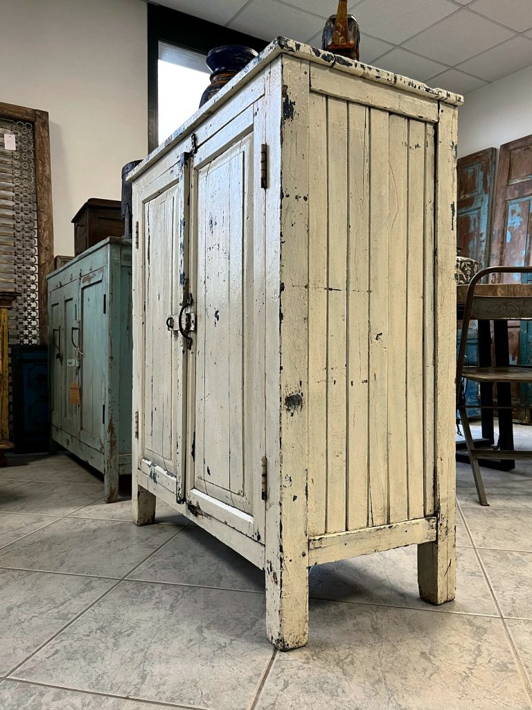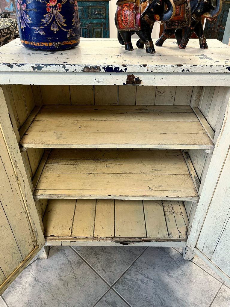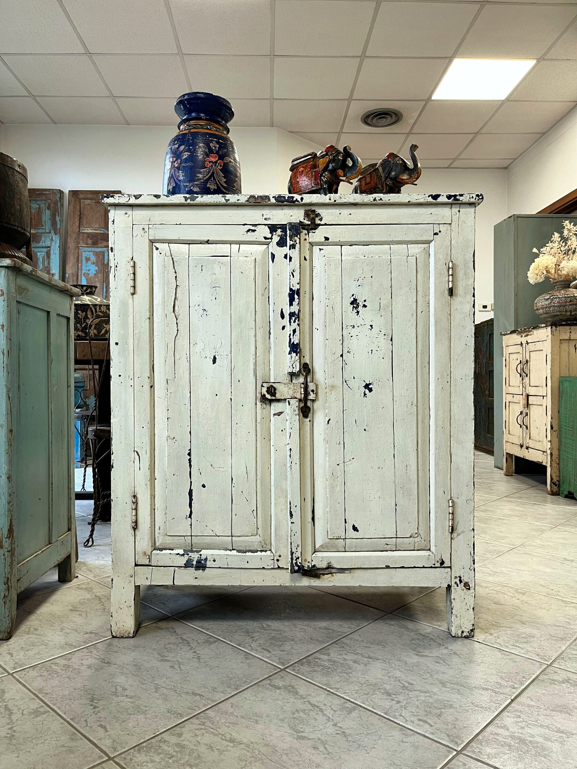Bellissimo mobiletto bianco con tracce di colore blu oltremare che affiorano in superficie.