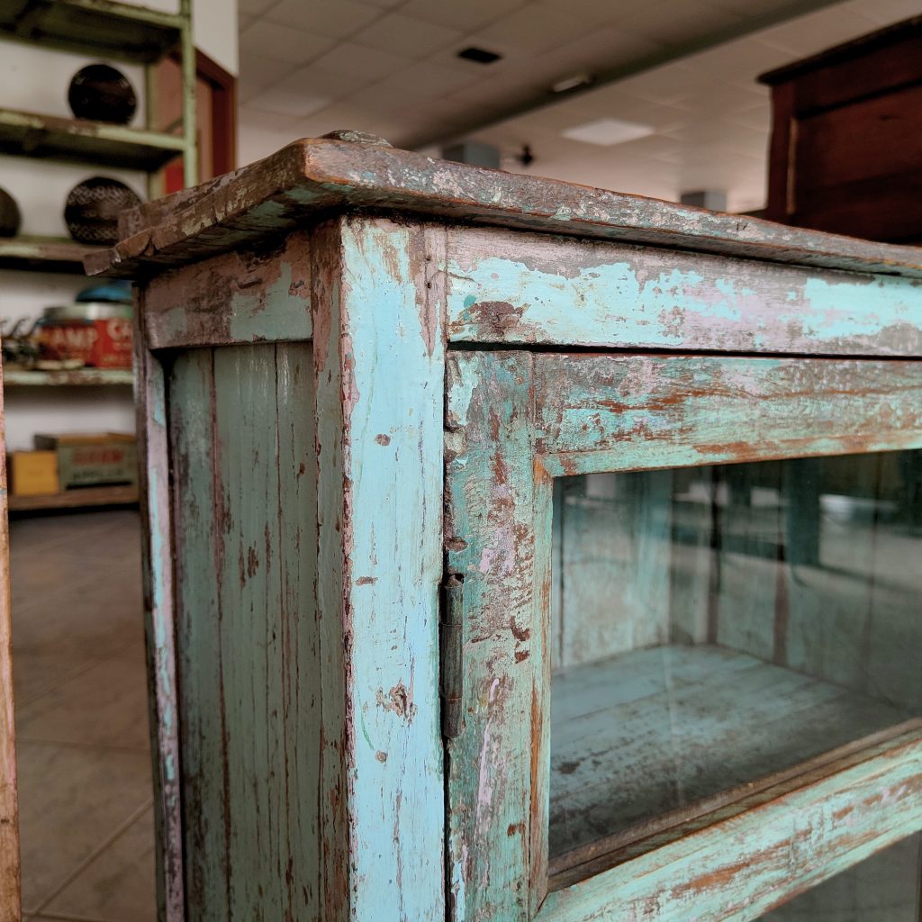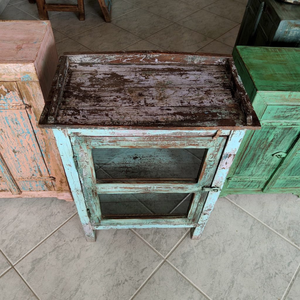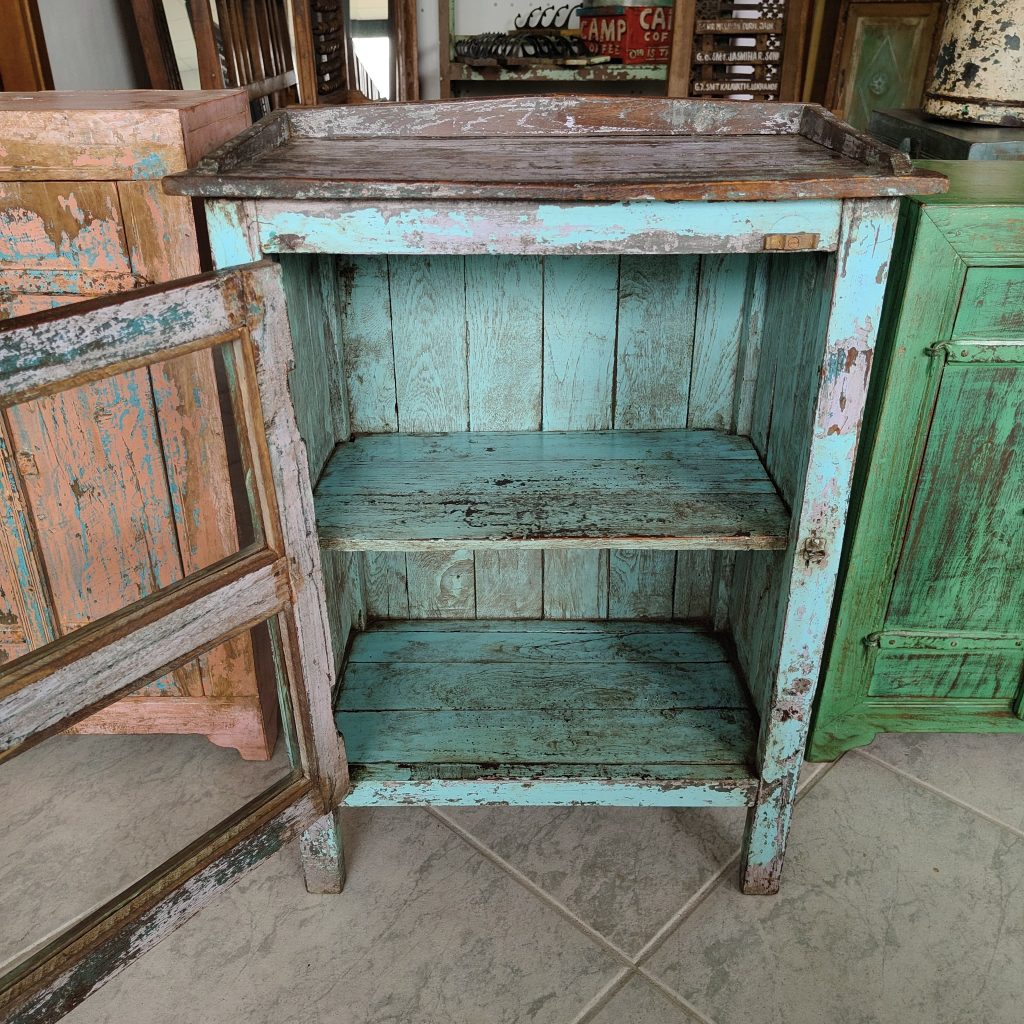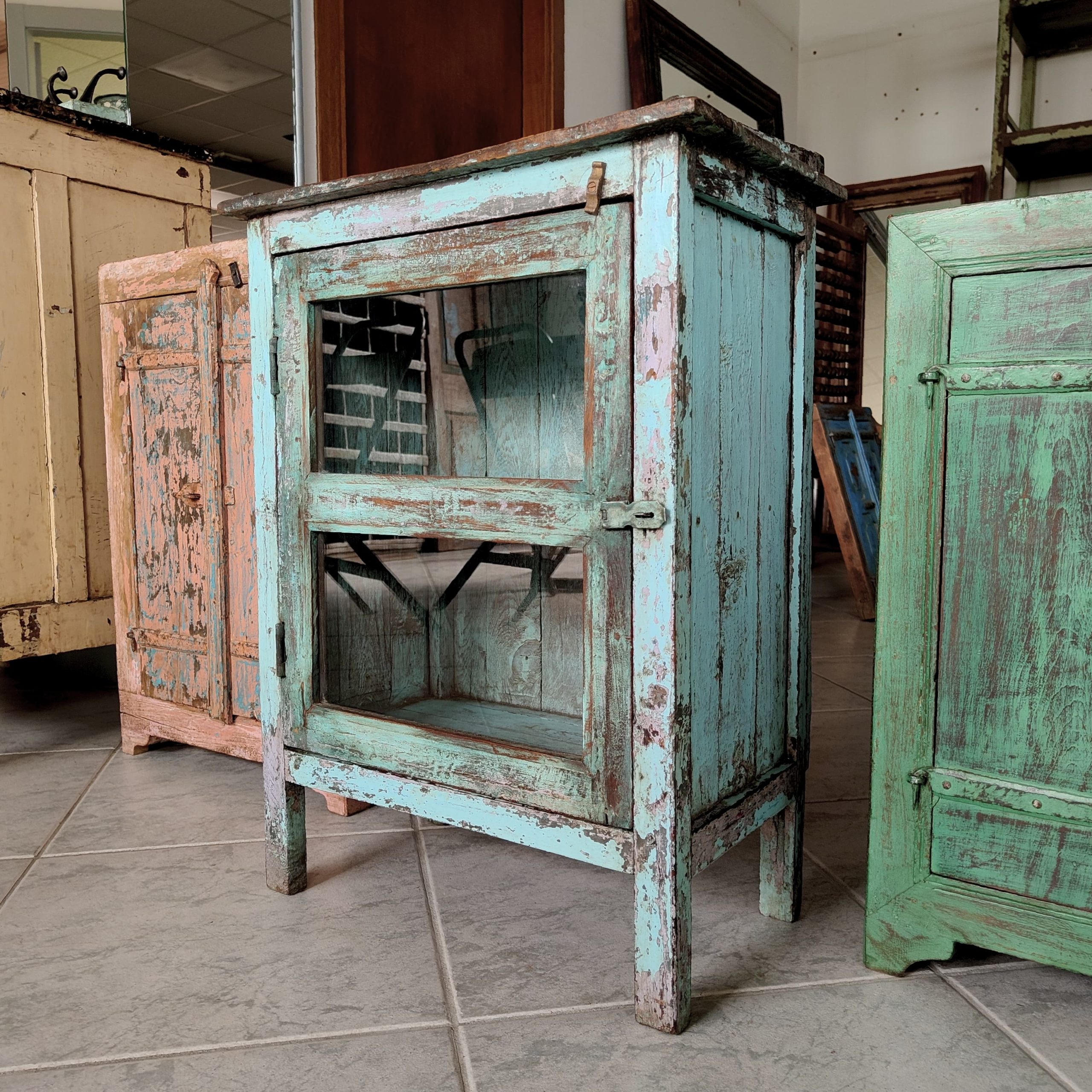 Piccolo credenzino/comodino, con anta in vetro, turchese con tracce di rosa antico, realizzato in legno di teak.
