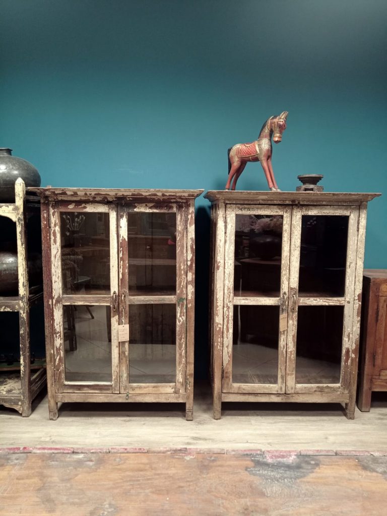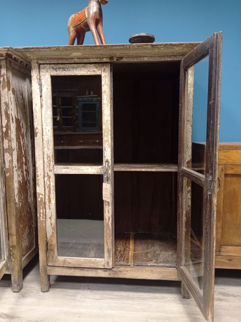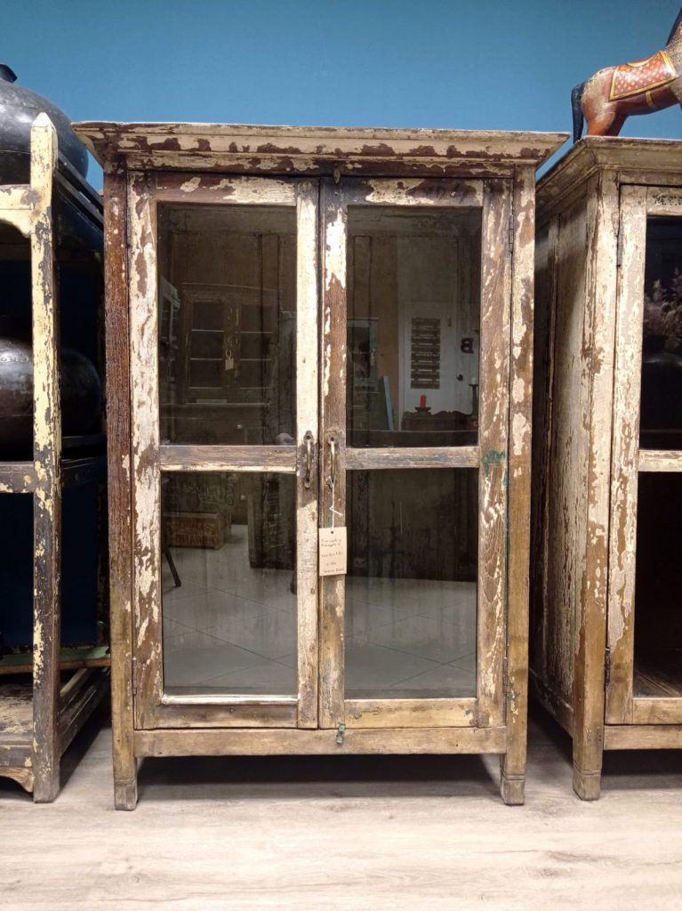 Vetrine in teak con residui di colore bianco / grigio che il trascorrere del tempo ha reso differenti .