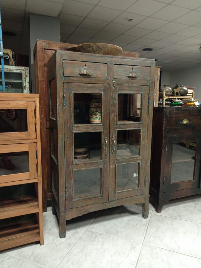 Bellissima vetrina in legno di teak con tre ripiani e due cassetti.