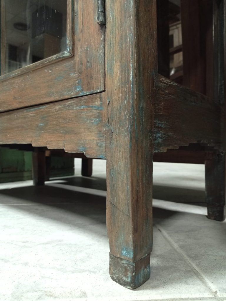 Le poche tracce di colore rimaste disegnano una trama sulla superficie del legno; mentre gli intagli alla base, vicino alle gambe, creano un movimento elegante e unico..