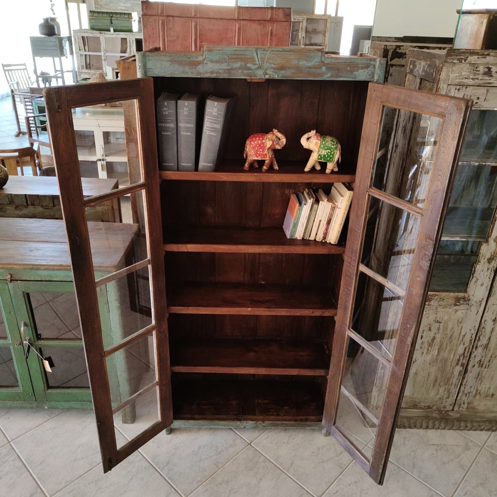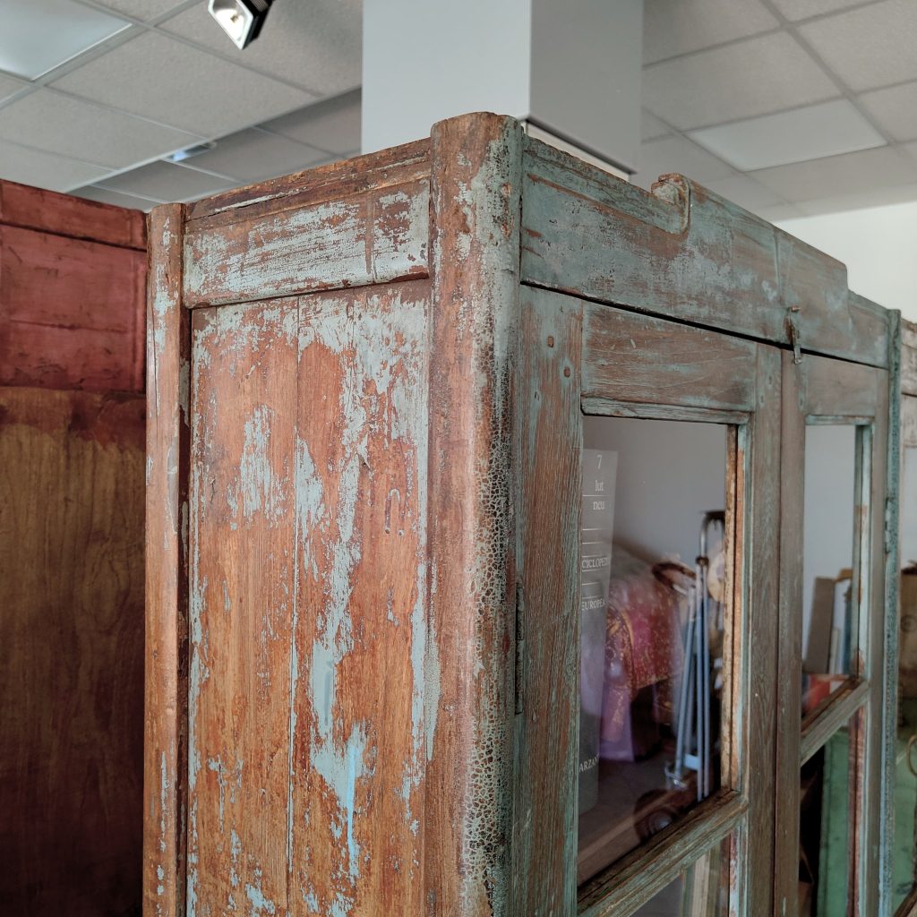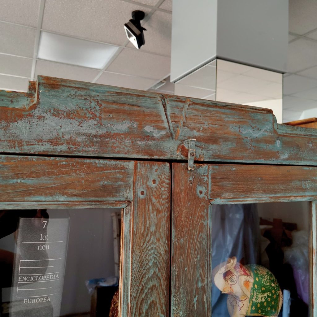 Bellissima vetrina con residui di colore blu/turchese, realizzata in legno di teak.