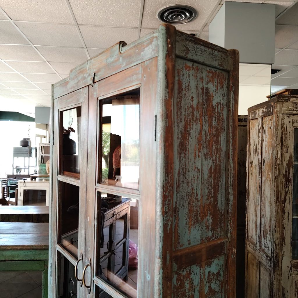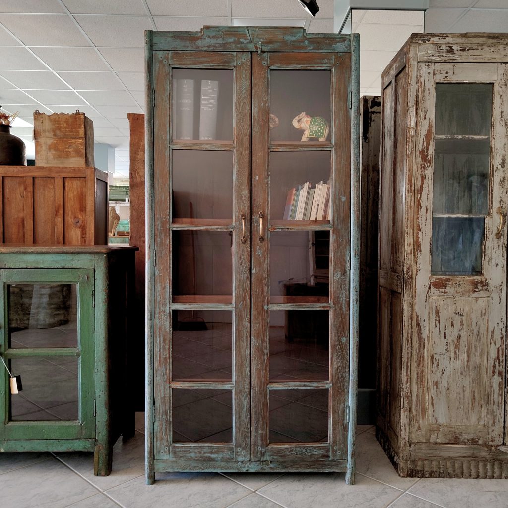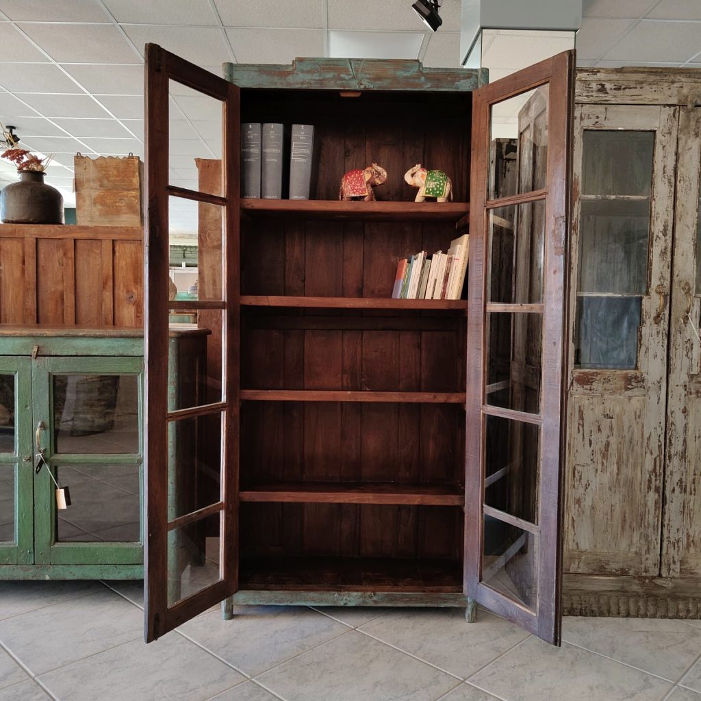 Bellissima vetrina con residui di colore blu/turchese, realizzata in legno di teak.